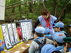 昼食後、忍者の扮装をして、全体集合しました。テーマソングの「勇気!100%」を歌った後、悪者忍者がたくさん現れ、スカウトたちにくれるはずのお宝を横取りしようとしました。スカウトたちは手裏剣で悪者忍者の足を攻撃し、見事撃退しました。 お宝はスカウト忍者のおかしらである「ドン・テルーオ」の手に戻り、スカウトたちは勝ち鬨を上げました。