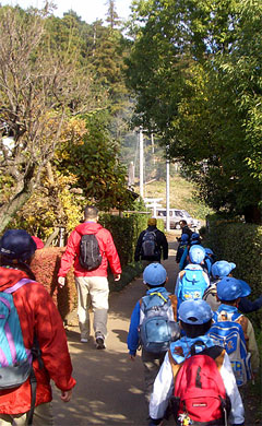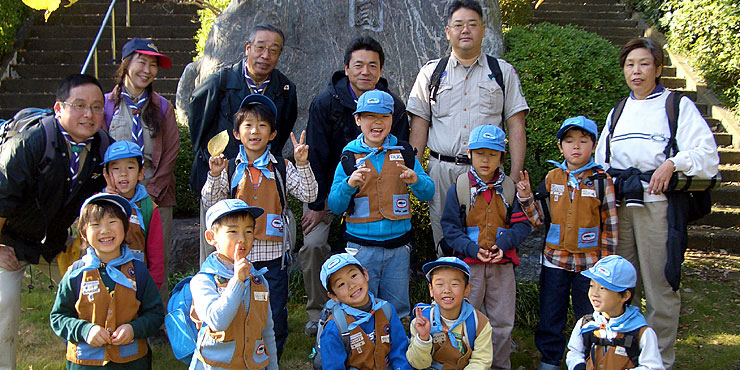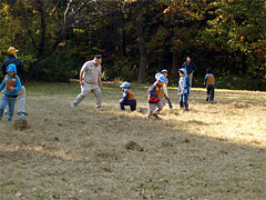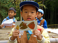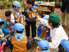 また、小鳥がえさを食べに集まる管理棟の前で静かに鳥が来るのを待ちました。その後少しフィールドアスレチックで遊んで、今度は住宅地を通って、東大和公園へ移動。スカウトは2つに分かれて、自分達で道を選んで歩きました。 公園内で昼食後、高台で気持ちのよい広場があったので、みんなで「5度当て」をして走り回りました。