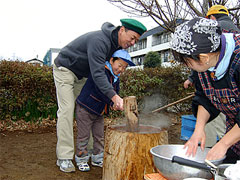 ビーバー隊が最初、カブ隊2、ガール2、大人と全部で6臼を搗き上げました。この日は天気予報が午後から雨。朝早く集まった時に、パラッと降った雨粒もすぐ止み、何とか天気は持ちこたえて、大きな混乱もなくみんなでもちつきを楽しむことができました。