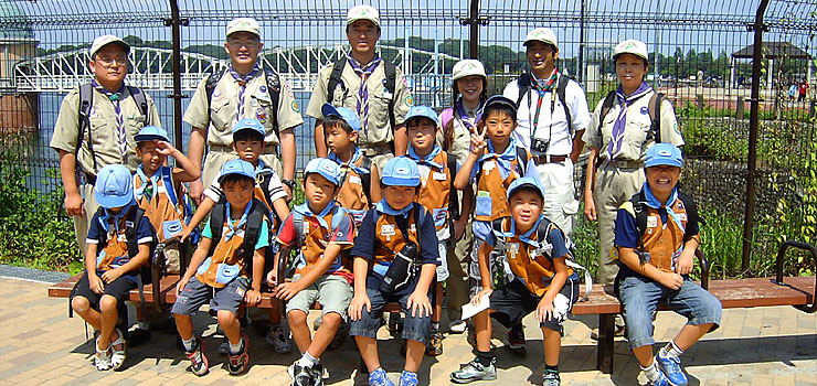 ▲暑い、暑いと日差しが厳しい中、ビーバースカウト隊全員で多摩湖の堰堤にて集合写真を撮りました