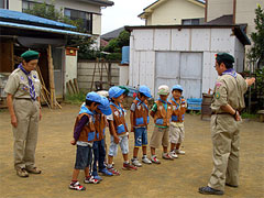 ▲野口団舍〜円形で集合。スカウトたちに集合形を教えるリーダー