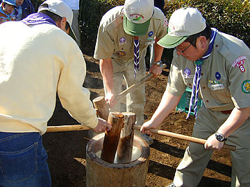 今回はベンチャー隊とボーイ隊のリーダー・スカウトの有志が参加して、庭に縛材を組み合わせた信号塔を作ってくれました。ビーバー隊、カブ隊のスカウトや