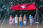 基本訓練を行いました。徒歩で近くの森に移動し、そこで集合隊形と基本動作の練習、宝さがしゲームを行いました。その後全員で協力して赤いフライシートを張り、ボーイスカウトの野外活動の雰囲気を楽しみました。 |