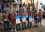 東村山駅前で赤い羽根共同募金を行いました。少ない人数ながら、スカウトが積極的に「せーの!」と声を合わせて募金の呼びかけをしてくれたおかげで、募金箱2つにたくさんの善意をいただくことができました。 |
